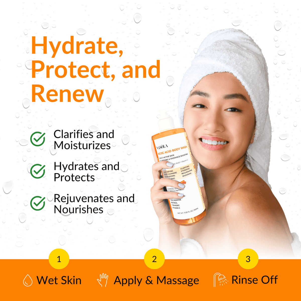 Crafted with naturally derived ingredients such as Kojic Acid, Turmeric, Vitamin C, Niacinamide, and Vitamin E, this body wash gently cleanses while promoting smooth, nourished, and glowing skin.