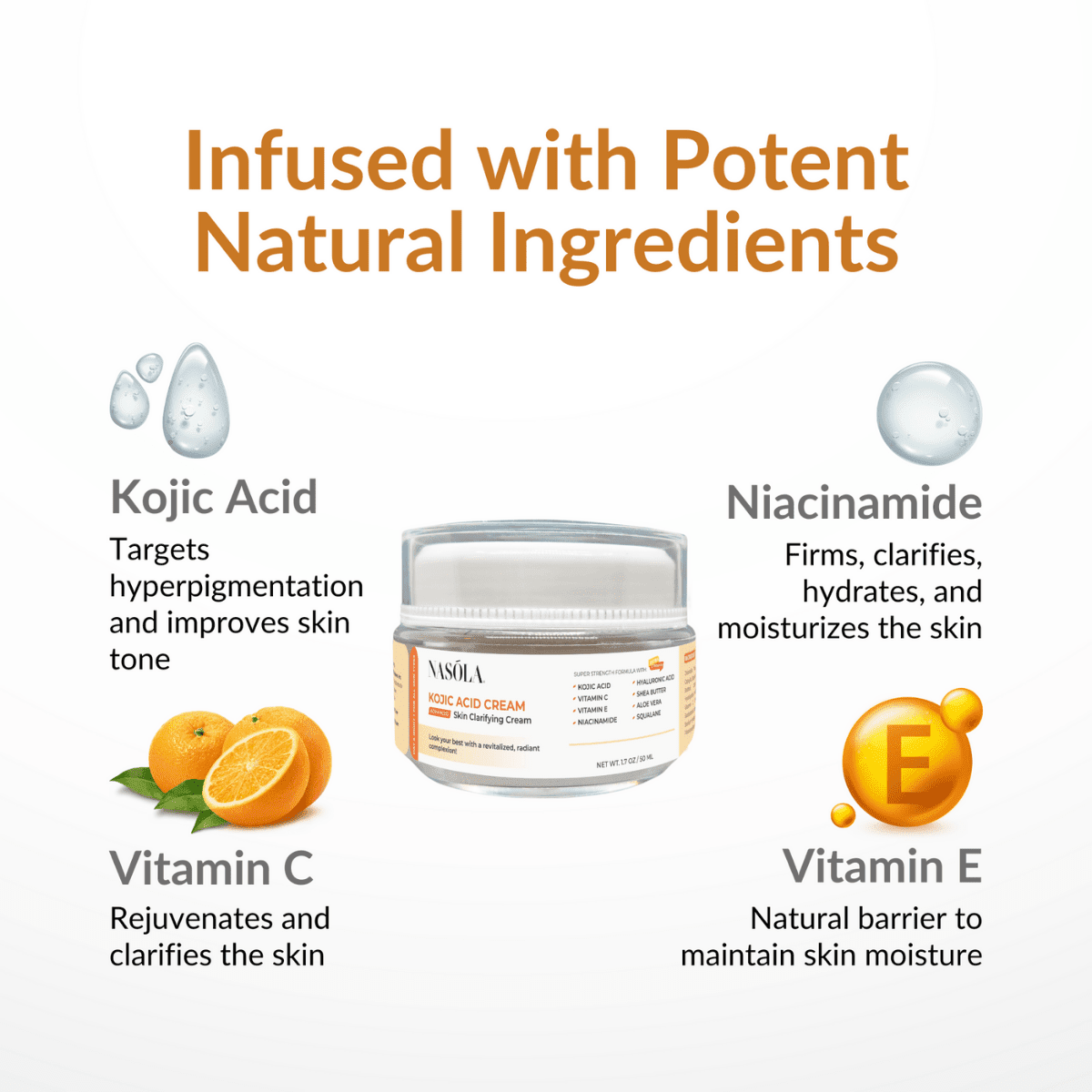 Experience lasting radiance with Nasola Kojic Acid Cream, your choice for a naturally brighter complexion. While many skin brightening creams rely on harsh chemicals, our formula is crafted with gentleness and safety in mind, using natural ingredients like Kojic Acid, Vitamin C, Vitamin E, Hyaluronic Acid, Niacinamide, Shea Butter, Aloe Vera, and Squalane.