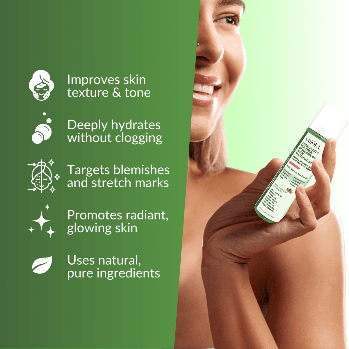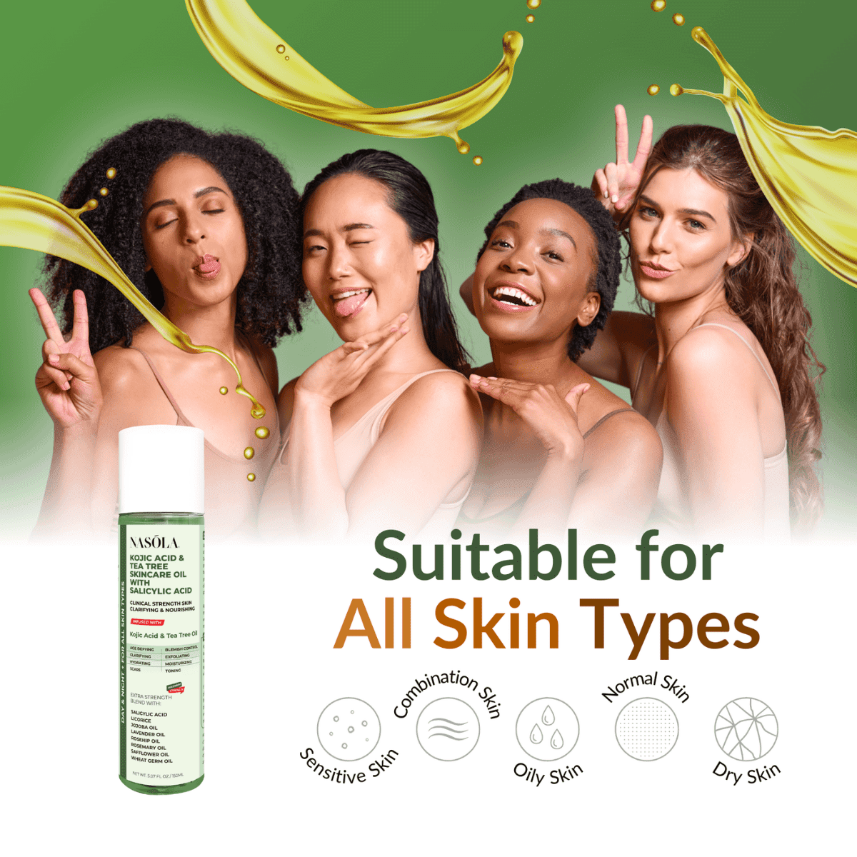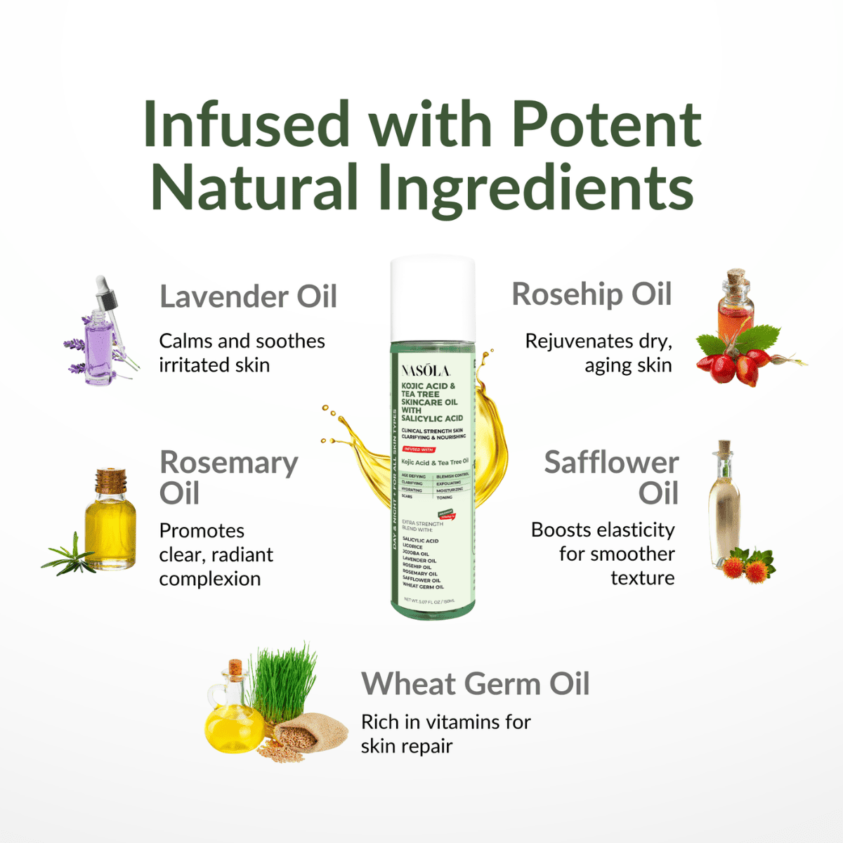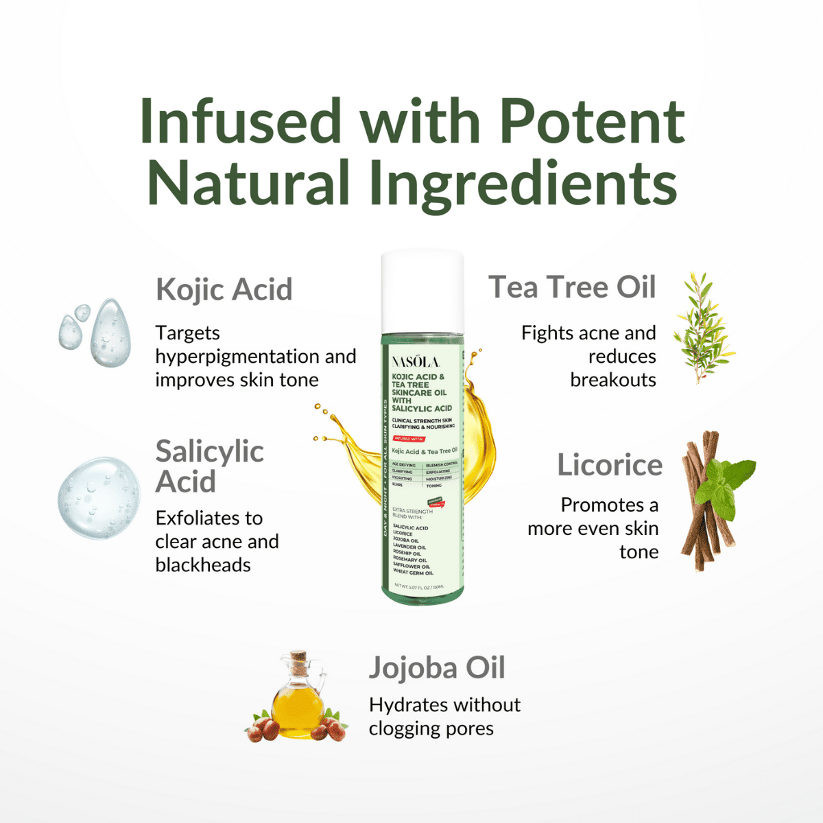 Embark on a new era of skin health with Nasola Kojic Acid & Tea Tree Skincare Oil with Salicylic Acid and allow your skin to reveal its natural beauty—clear, radiant, and refreshingly alive.