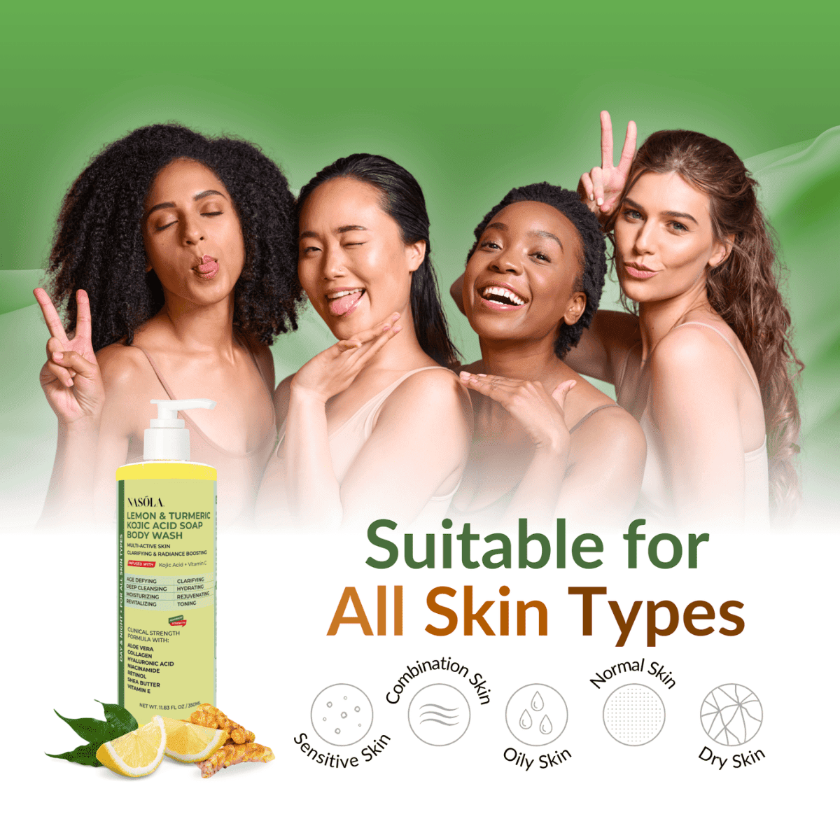 Embrace the Nasola Lemon & Turmeric Kojic Acid Soap Body Wash – a testament to beauty, brilliance, and wellness converging in every wash.