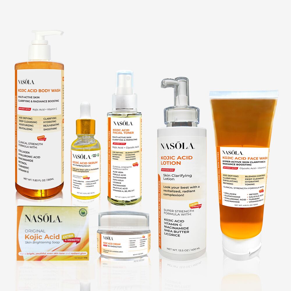 This comprehensive set combines the powerful benefits of Kojic Acid and other natural, skin-loving ingredients to deliver radiant, even-toned, and glowing skin from head to toe.