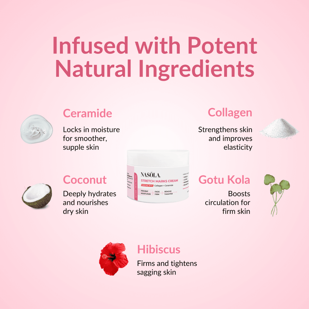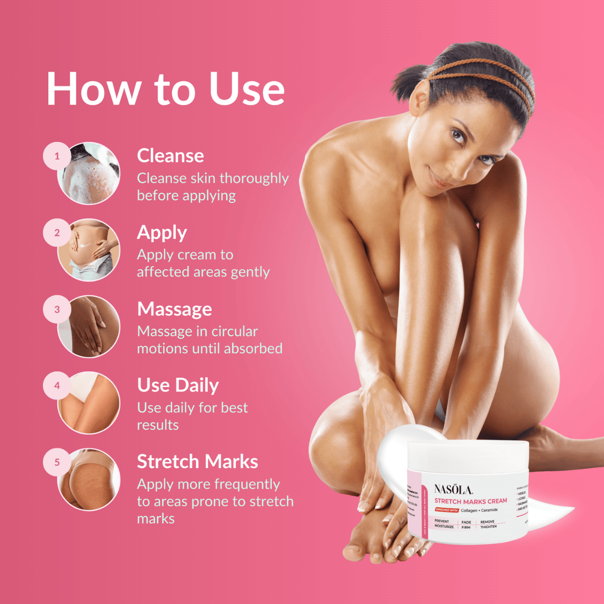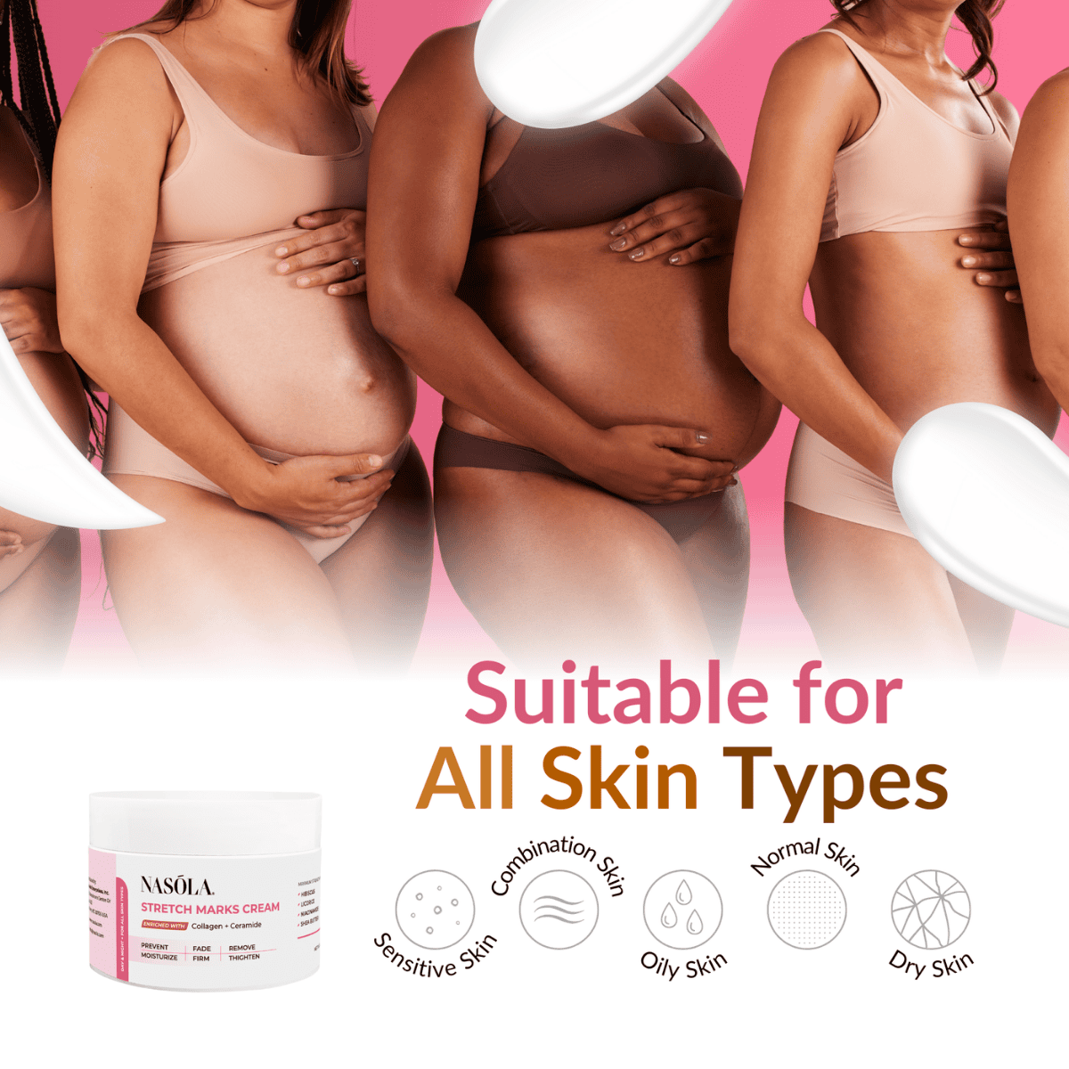 Nasola Stretch Marks Cream is perfect for all skin types and can be used on the stomach, breasts, hips, thighs, buttocks, etc. We passionately developed this cream to help anyone with stretch marks, whether from pregnancy, weight gain, or genetics.
