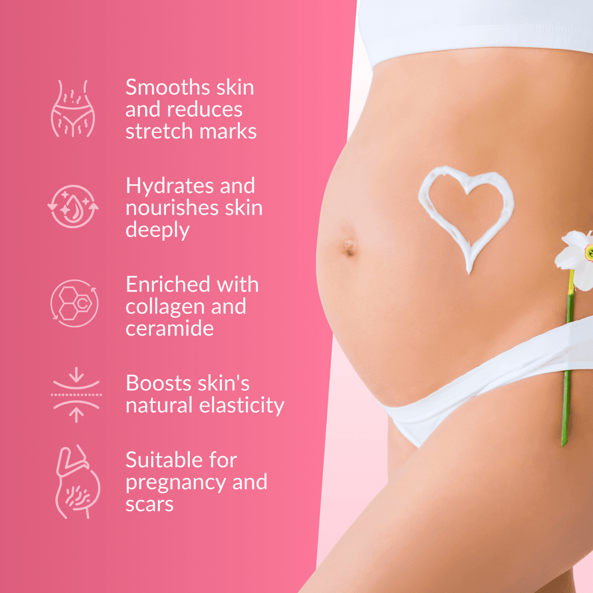 Our cream contains a unique blend of plant-based and naturally occurring ingredients that help repair and regenerate skin cells and improve elasticity while providing intense hydration. It’s perfect for old and new stretch marks and all body areas.